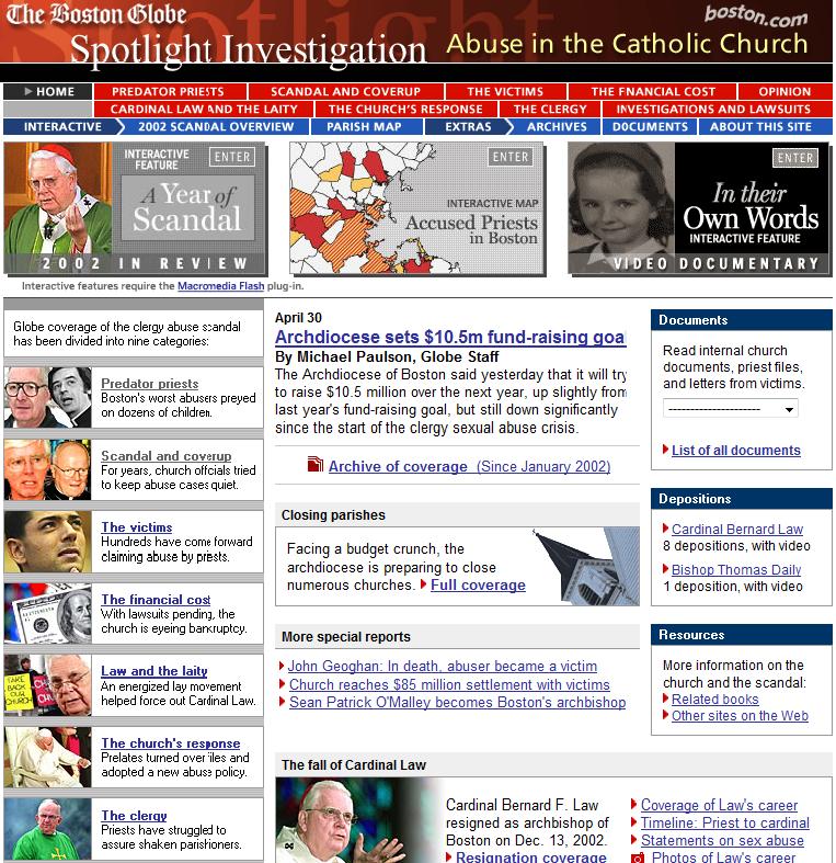 La documentazione processuale degli scandali pedofili che hanno annichilito la Chiesa cattolica d’America nel 2002, raccolta nell’archivio del Boston Globe. E’ questo il quotidiano Usa che, insieme al New York Times, ha seguito con maggiore assiduità e coerenza le vicende criminali venute alla luce nei primi anni Duemila di cui si sono resi protagonisti preti e vescovi d’Oltreoceano.